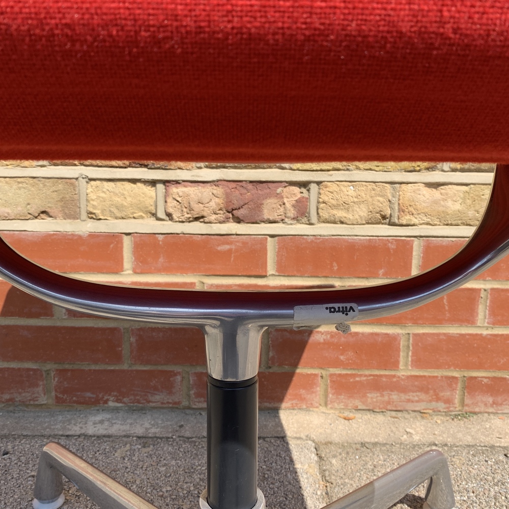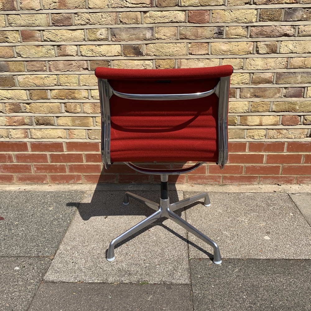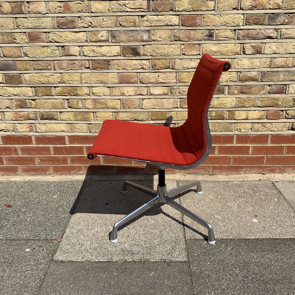 Charles and Ray Eames created an icon of the twentieth century with their design of the Aluminium Chairs EA 105-108. These famous classics are found in countless homes and living spaces around the globe. Aluminium Chair EA 108, Red Hopsak, Four Star Swivel Base with Glides.