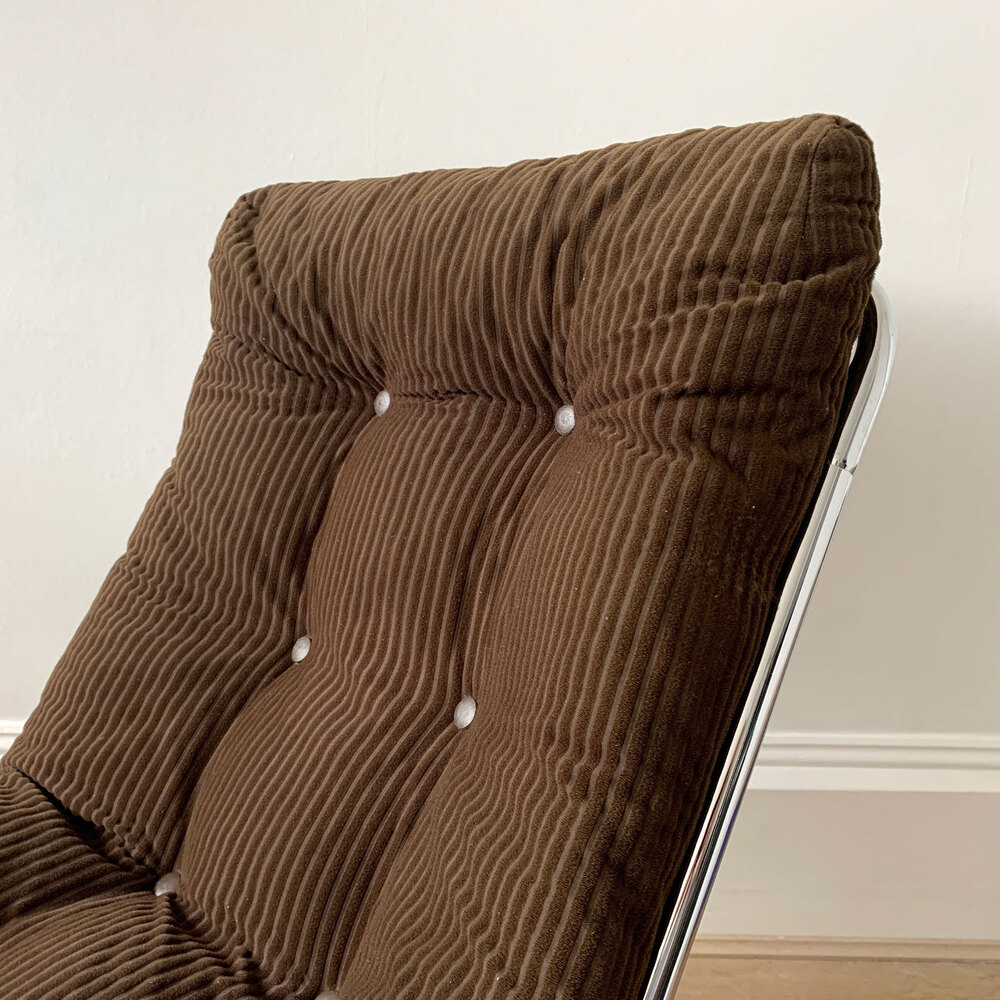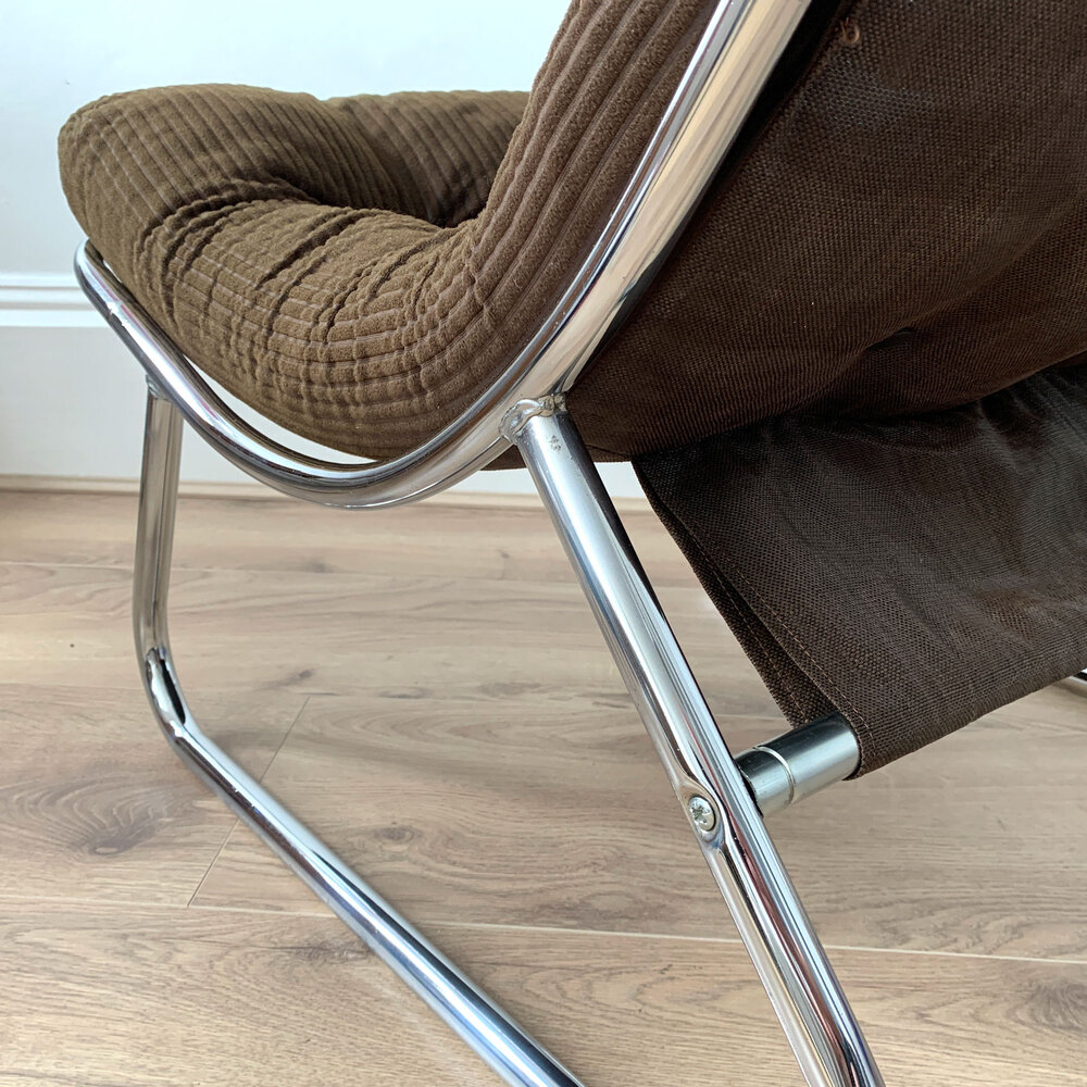 Mid Century Lounge Chair by renowned British designer Peter Hoyte. 1970s Original brown corduroy upholstery on canvas sling, with a tubular chrome sled base.