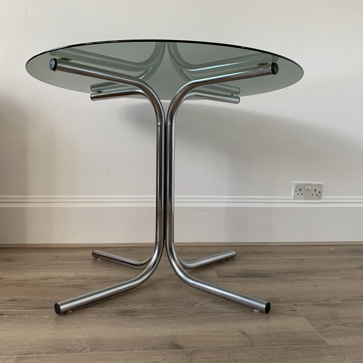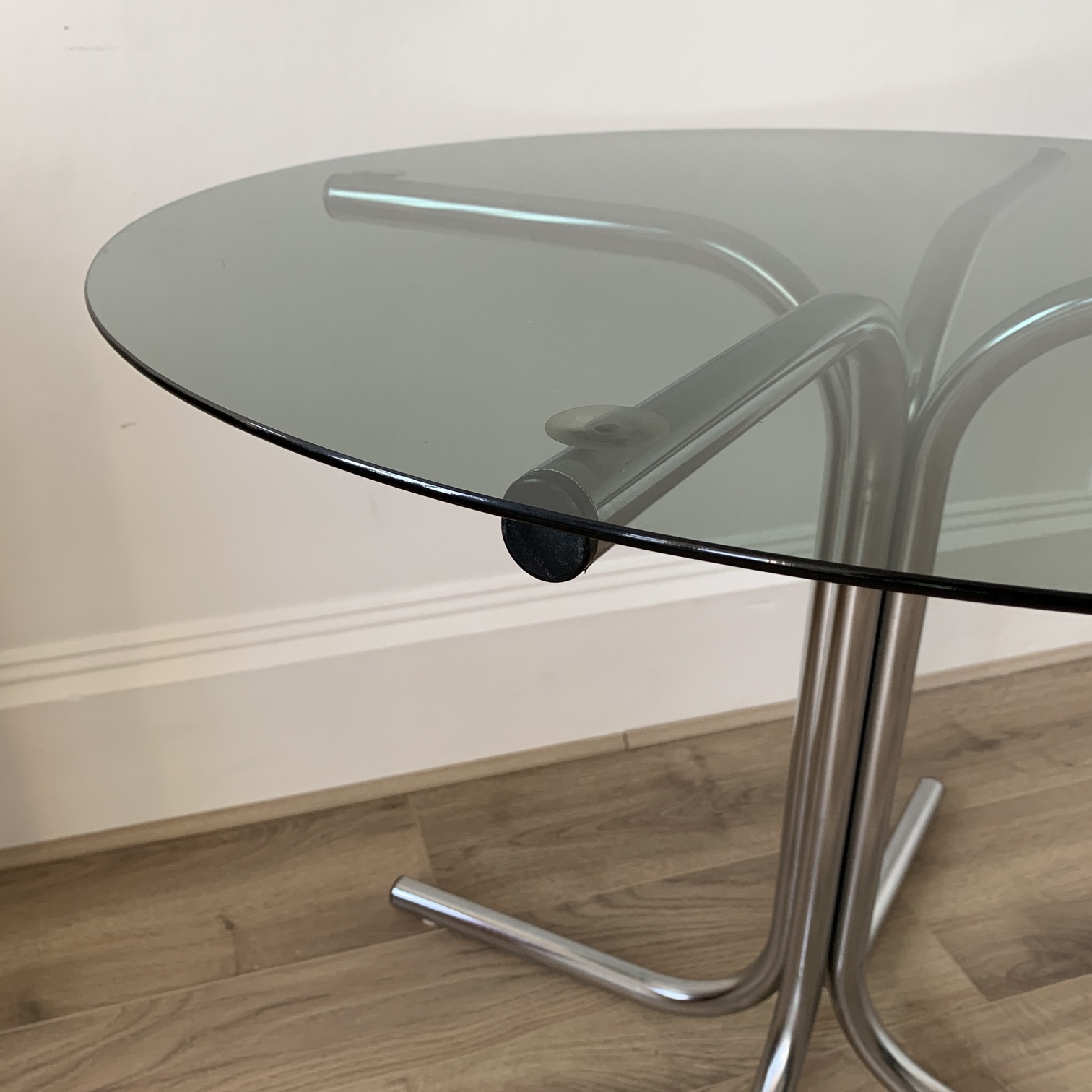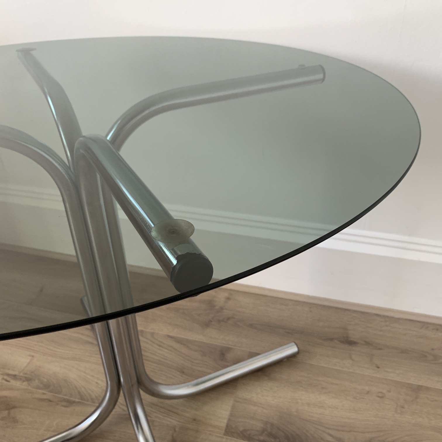 Space age dining table with chrome tubular steel legs and smoked glass top.