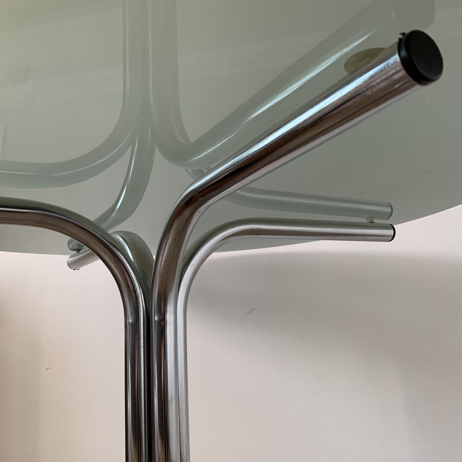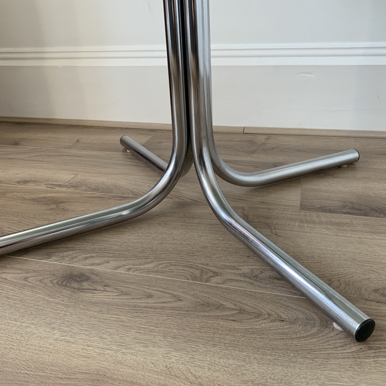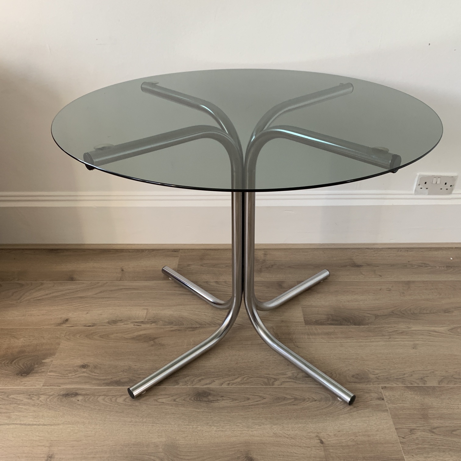 Space age dining table with chrome tubular steel legs and smoked glass top.